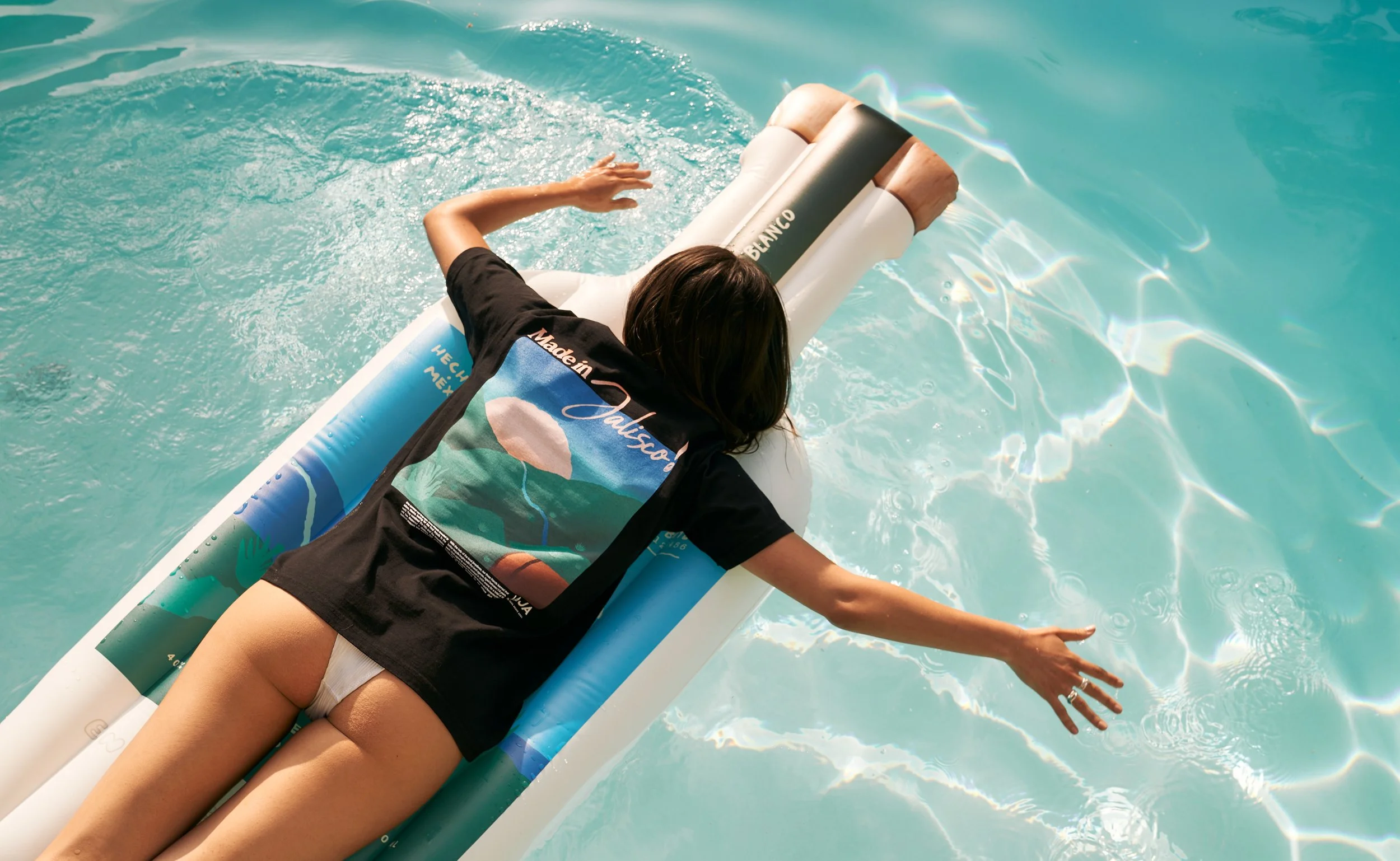Person lying face down on an inflatable pool float in a swimming pool, wearing a black t-shirt and white underwear, with the float being white and blue.