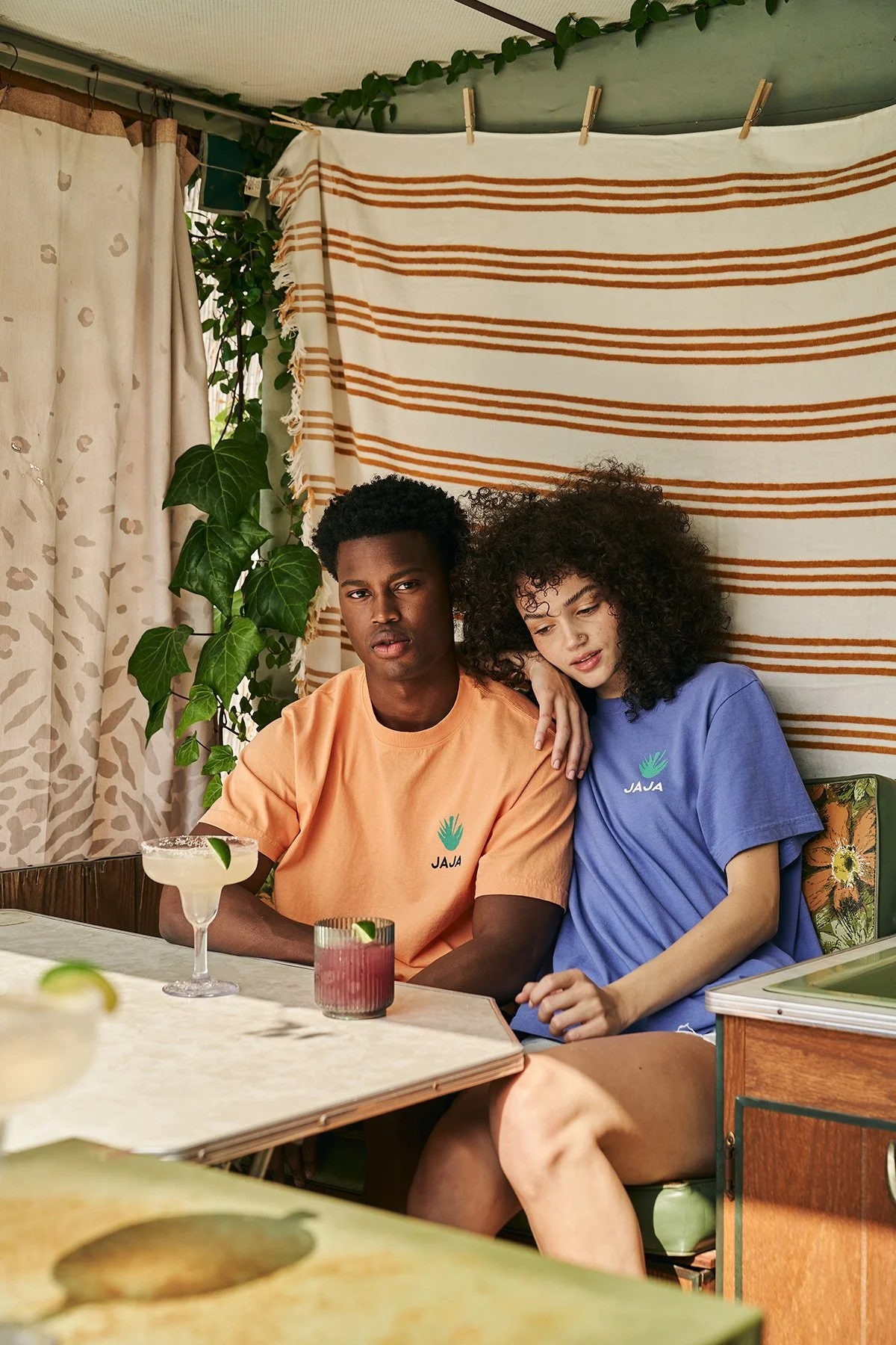 A young man and woman sit together at a table with tropical-themed drinks, in an indoor-outdoor setting with plants and striped fabric in the background. Both are wearing colorful T-shirts with a logo and the word "JAJA." The woman leans on the man's