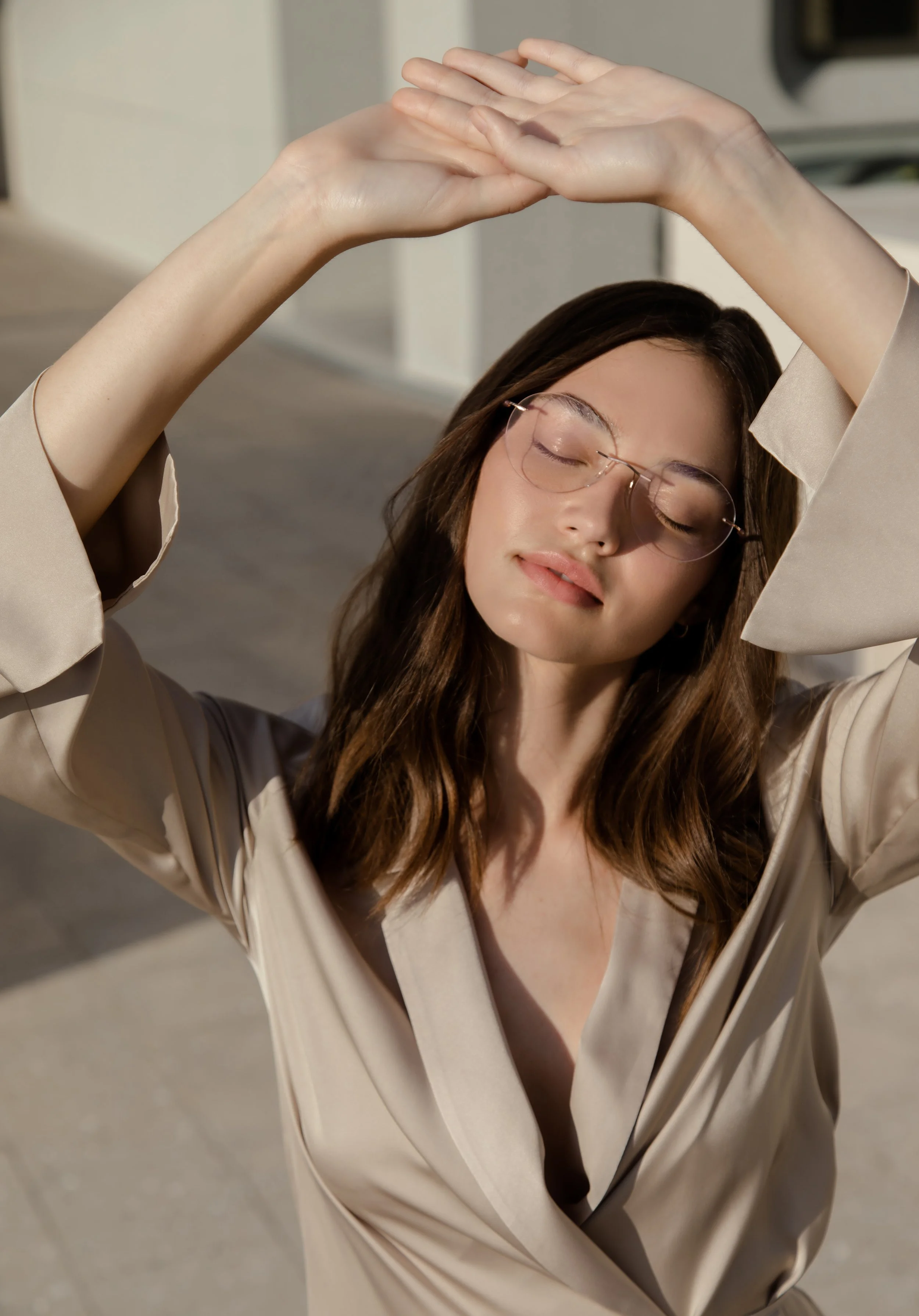 A young woman with long brown hair and glasses, eyes closed, leaning back in sunlight with her arms raised above her head, wearing a beige blouse.