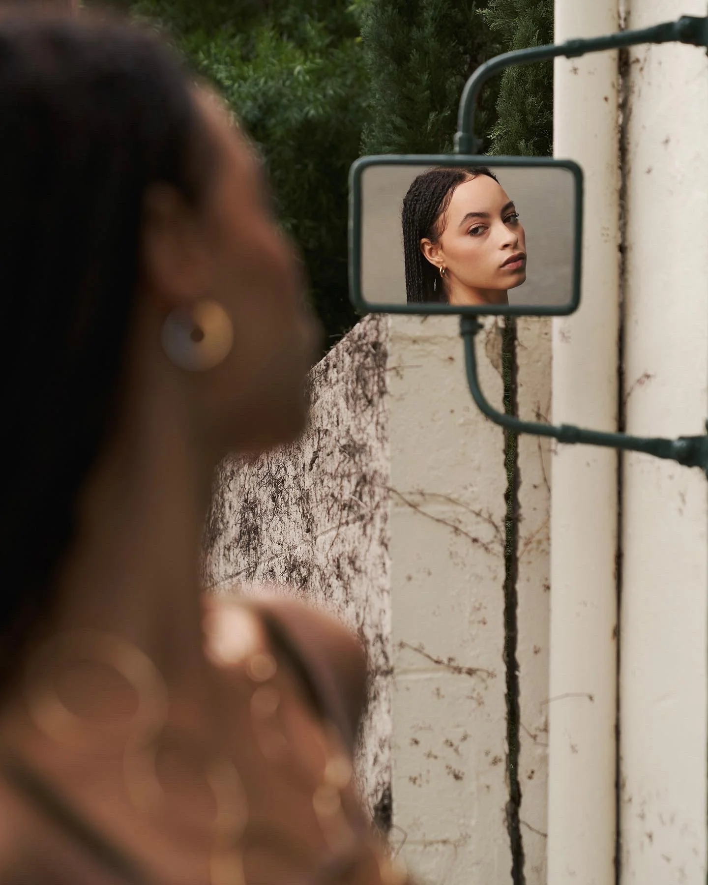 A woman with braided hair and hoop earrings looking into a small mirror that is mounted on a white wall, with her reflection showing a serious expression.