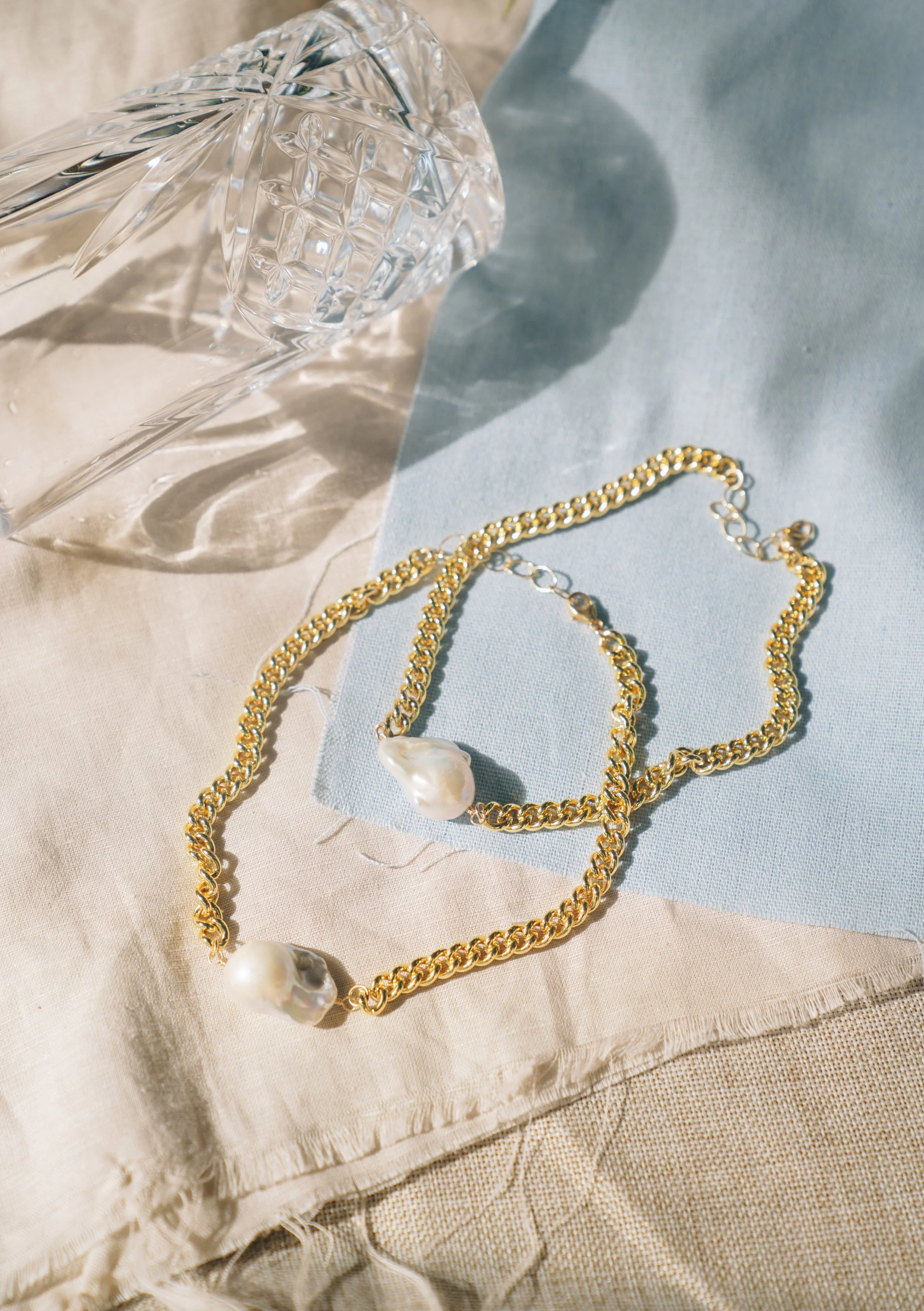 Gold chain necklace with large pearl beads on a layered fabric background with a cut glass vase nearby.