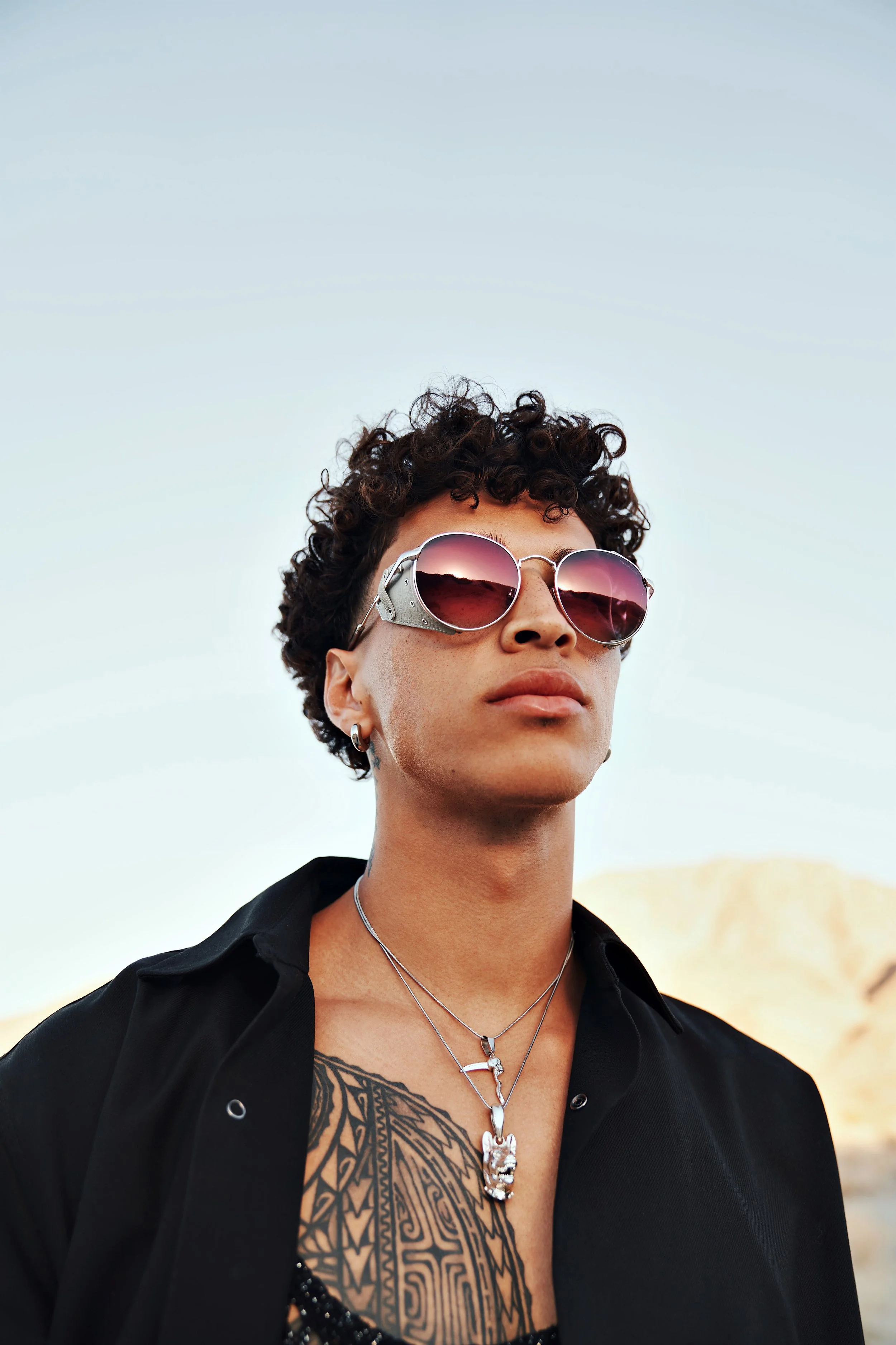 A person with short curly hair wearing mirrored sunglasses, silver earrings, layered necklaces, and a black open shirt, standing outdoors with desert landscape in the background.