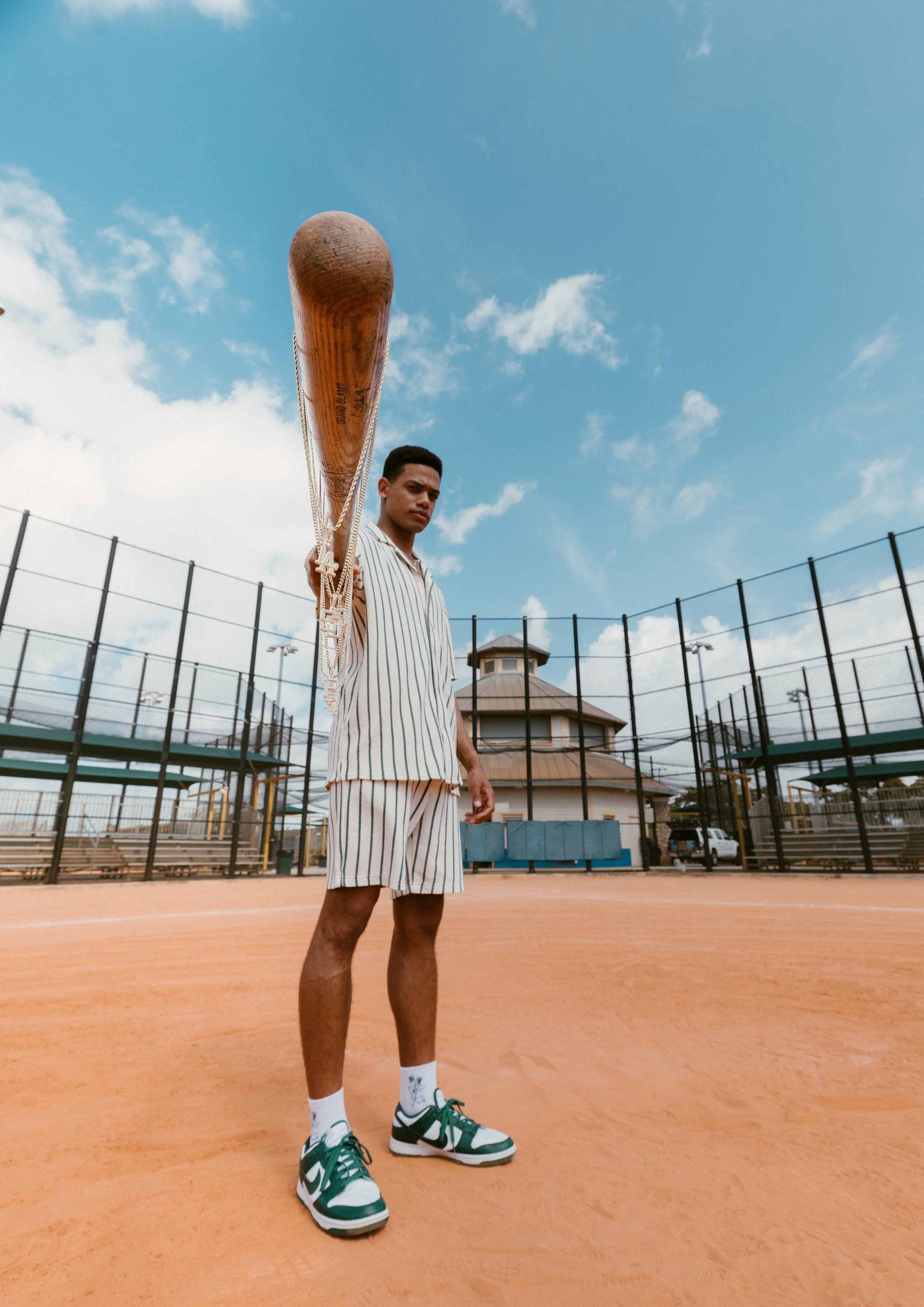 Young man in striped pajamas holding a baseball bat on a tennis court under a partly cloudy sky.