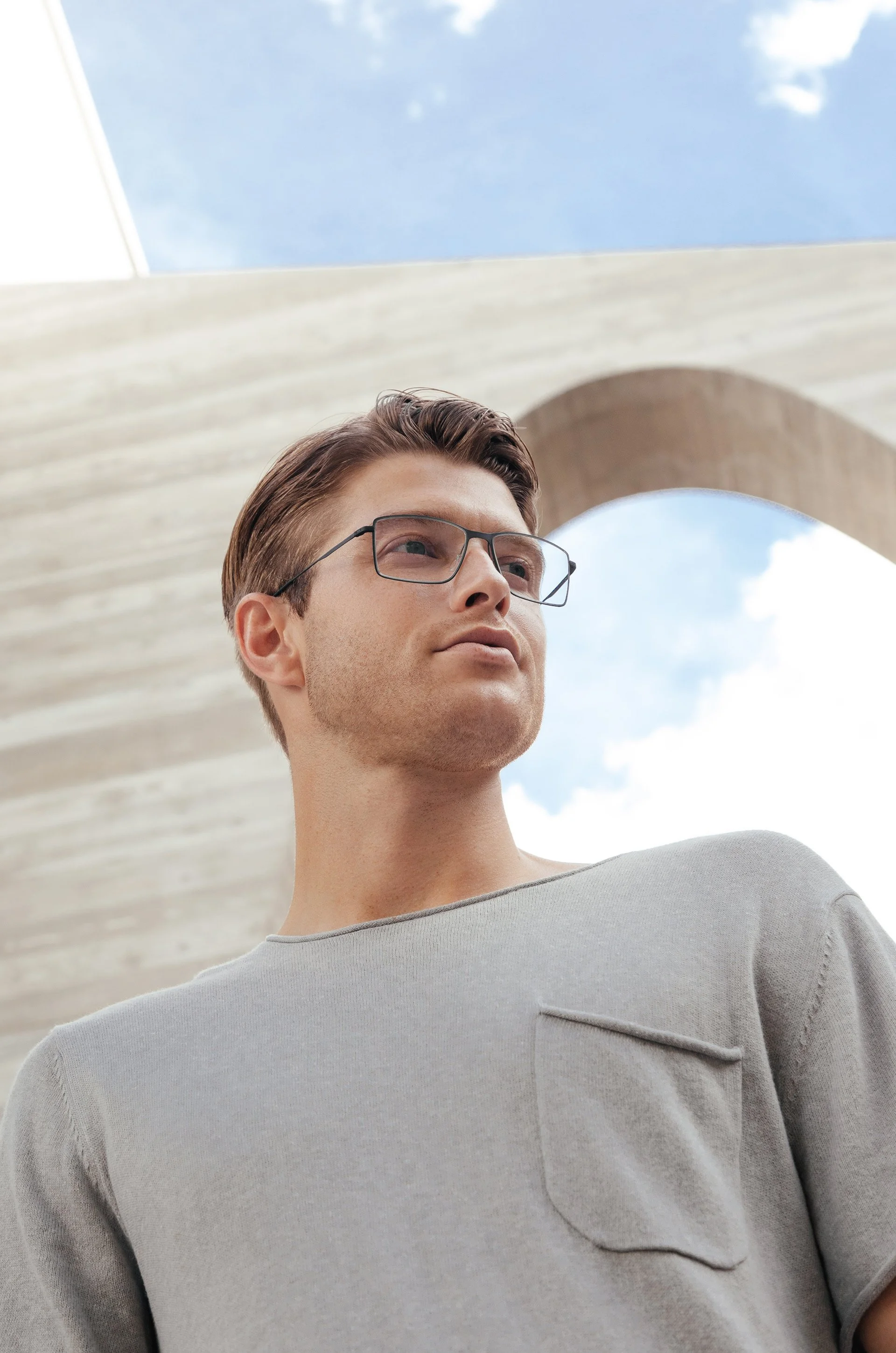 A young man with brown hair and glasses stands outdoors, looking into the distance. Behind him is a modern architectural structure with an arch, against a partly cloudy sky.