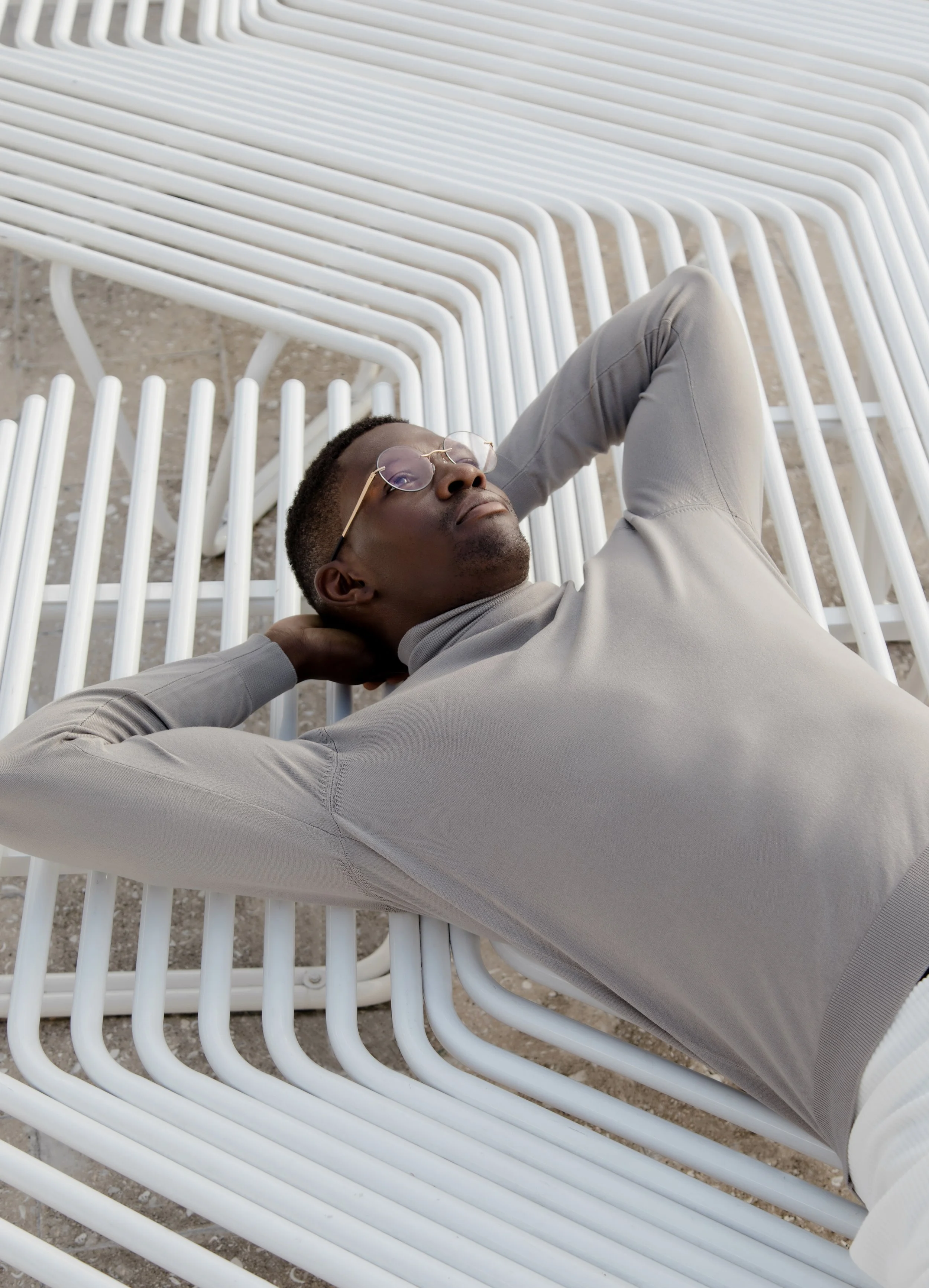 A man lying on a white modern outdoor lounge chair with his eyes closed, wearing glasses and a light grey long sleeve shirt, relaxing outdoors.