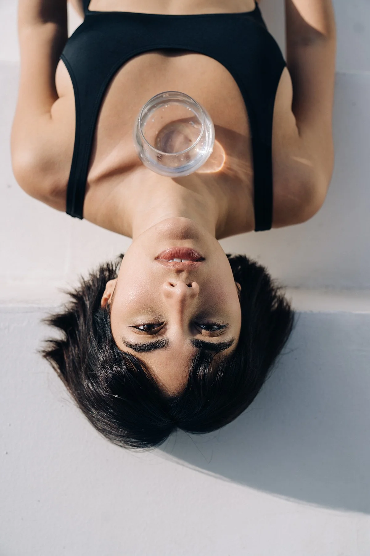 A woman with black hair lying on her back on a white surface, holding a glass of water, wearing a black top.