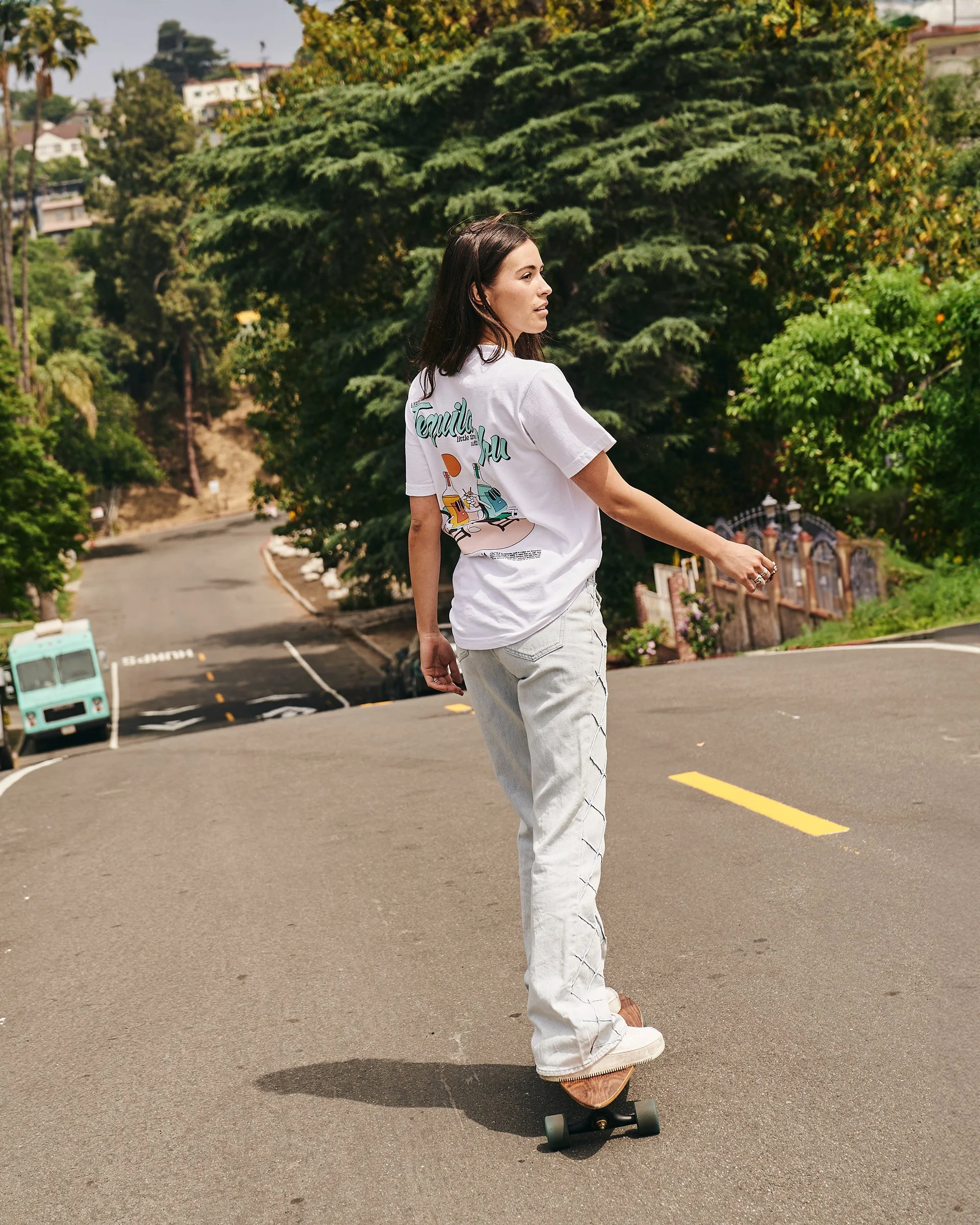 Young woman skateboarding on a suburban street with trees and houses in the background.