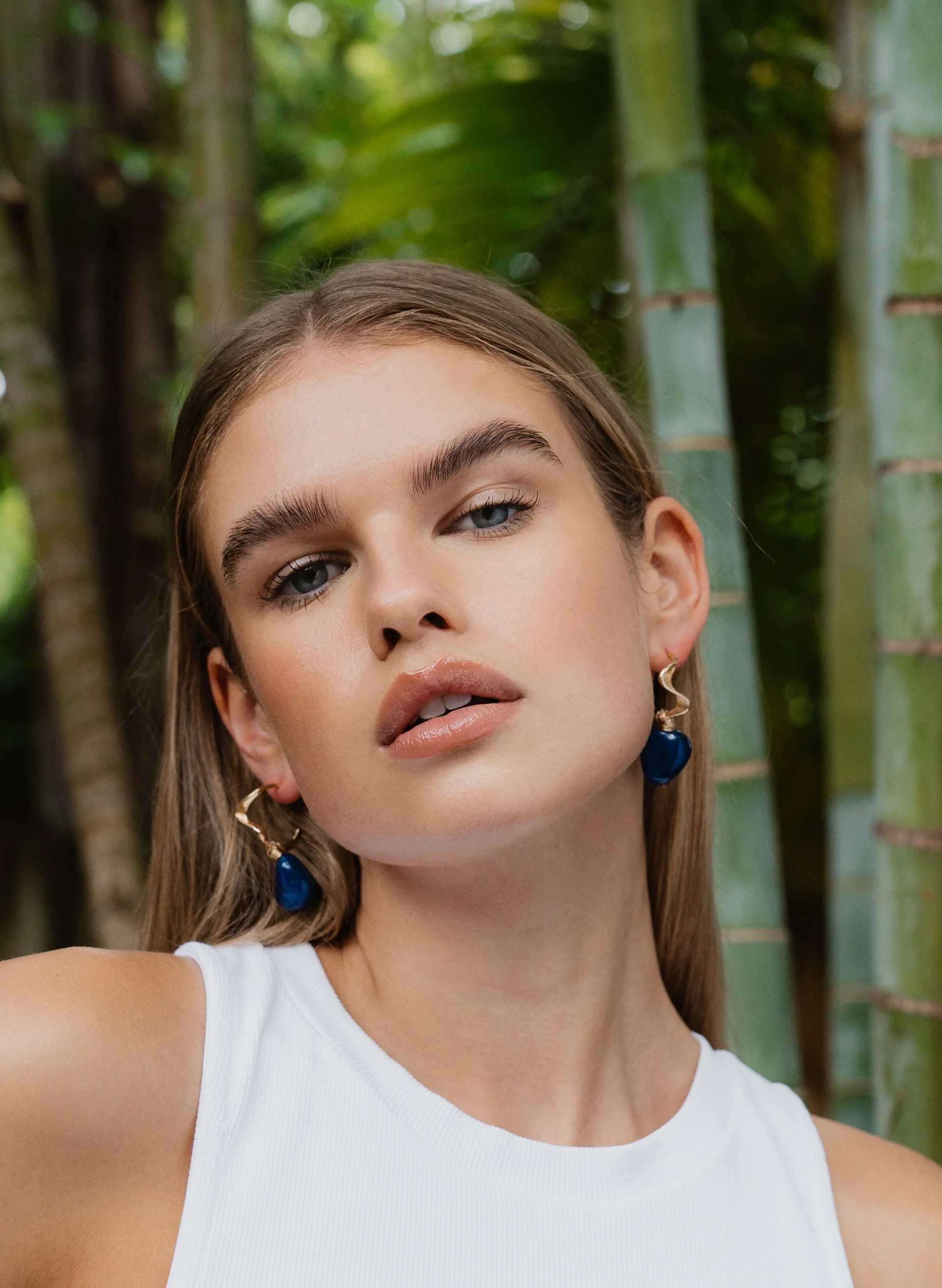 A woman with light skin, blue eyes, and brown hair wearing large blue earrings and a white top, posing outdoors with green bamboo in the background.