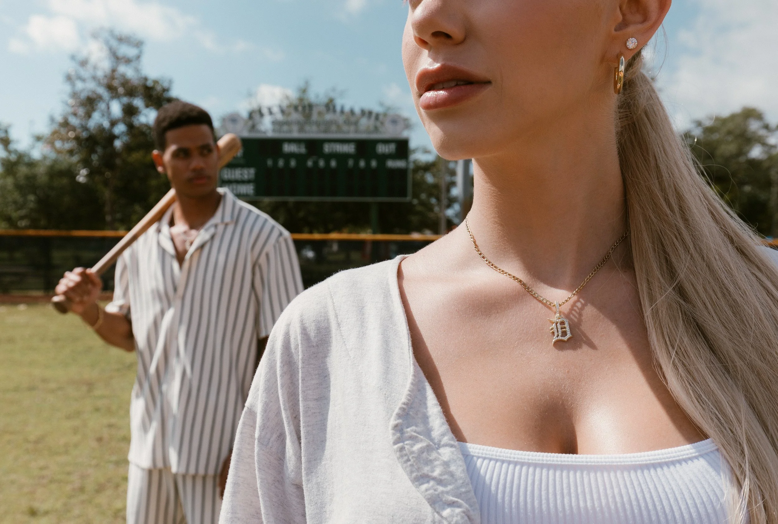 A close-up of a blonde woman wearing a gold chain with a 'D' pendant, earrings, and a white top, with a young man holding a baseball bat in the background on a baseball field.