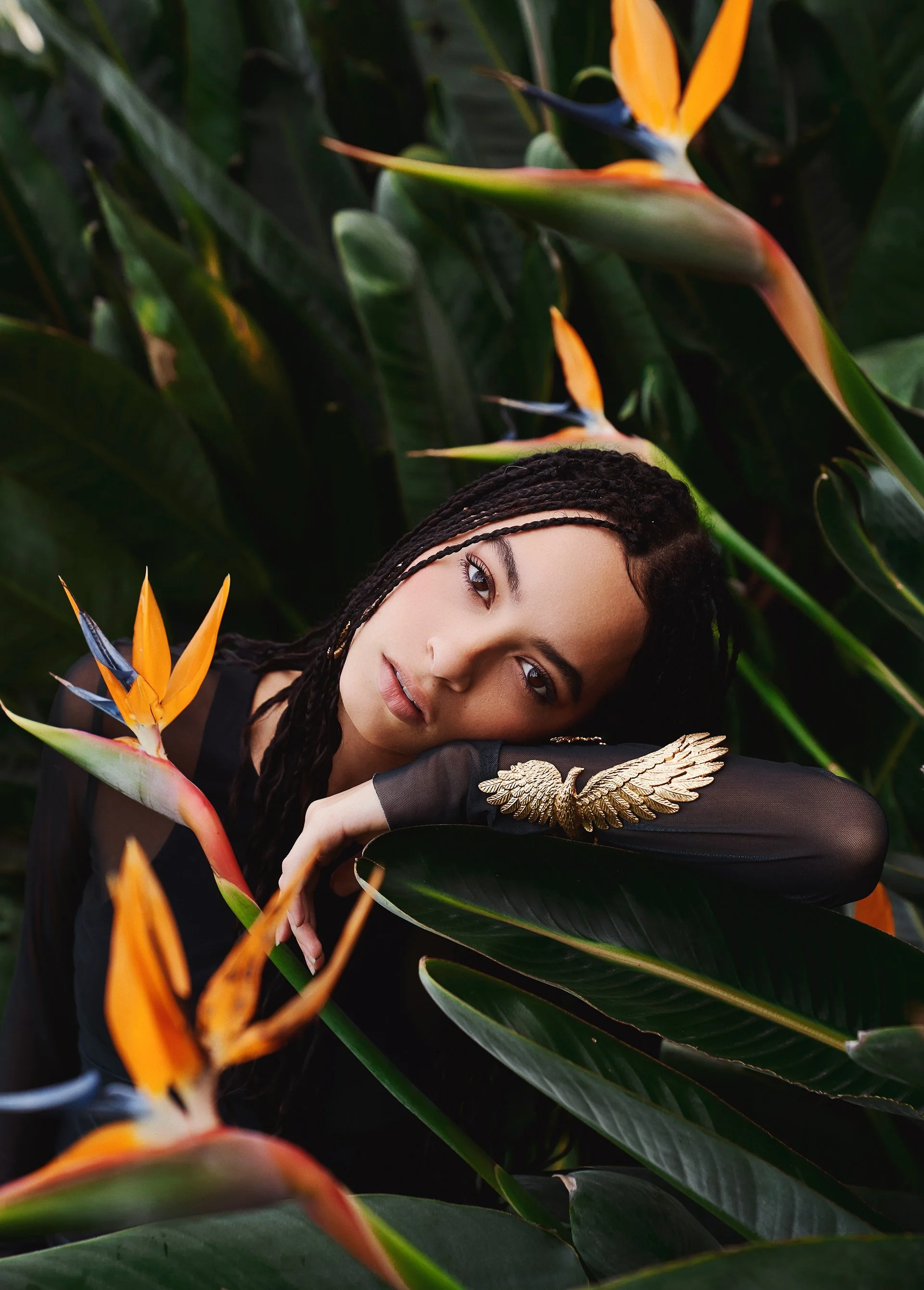 A woman with braided hair lying among green tropical plants and orange flowers, wearing a black sheer garment with a gold wing detail on her arm.