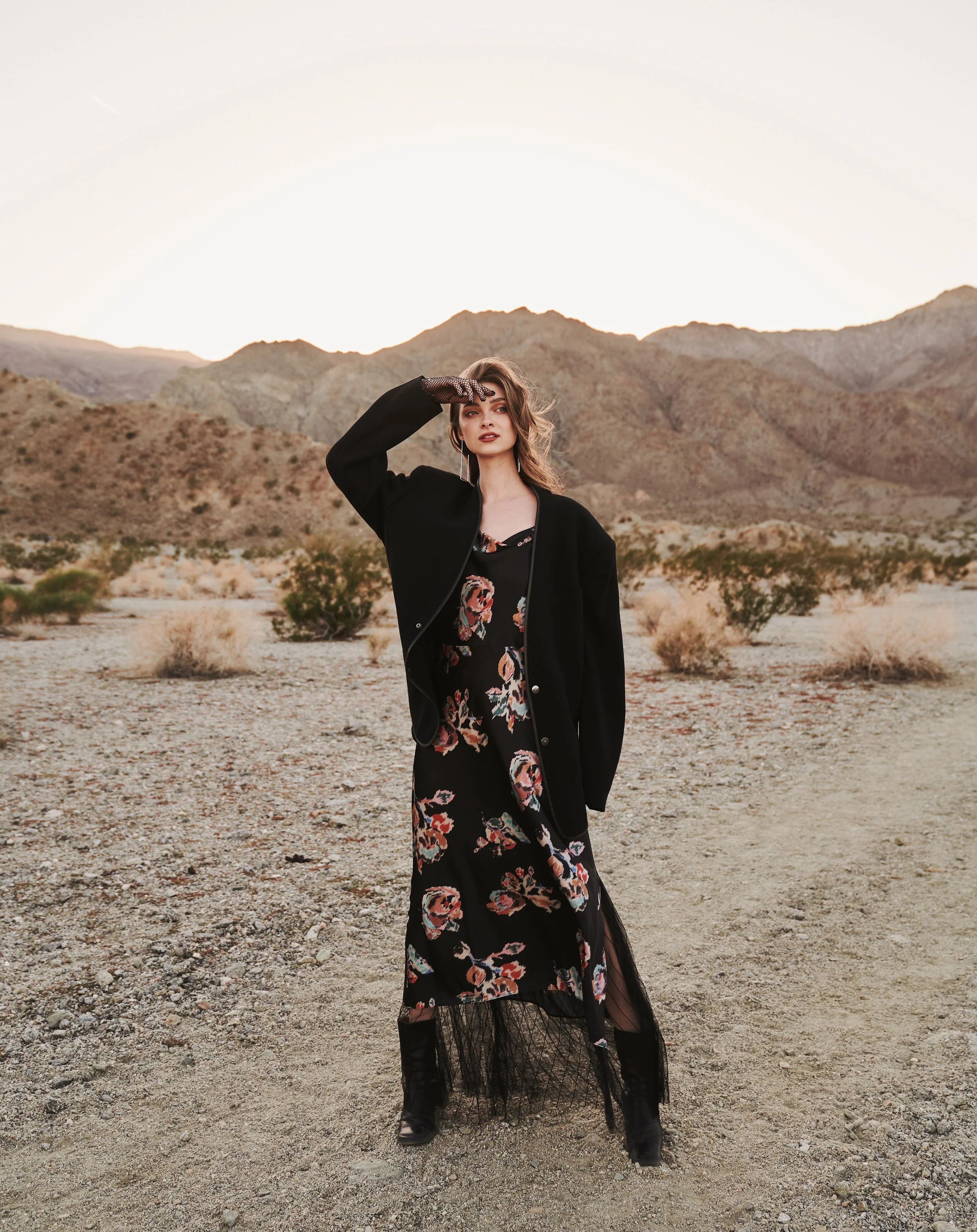 A woman in a floral dress and black jacket standing in a desert landscape with mountains in the background.