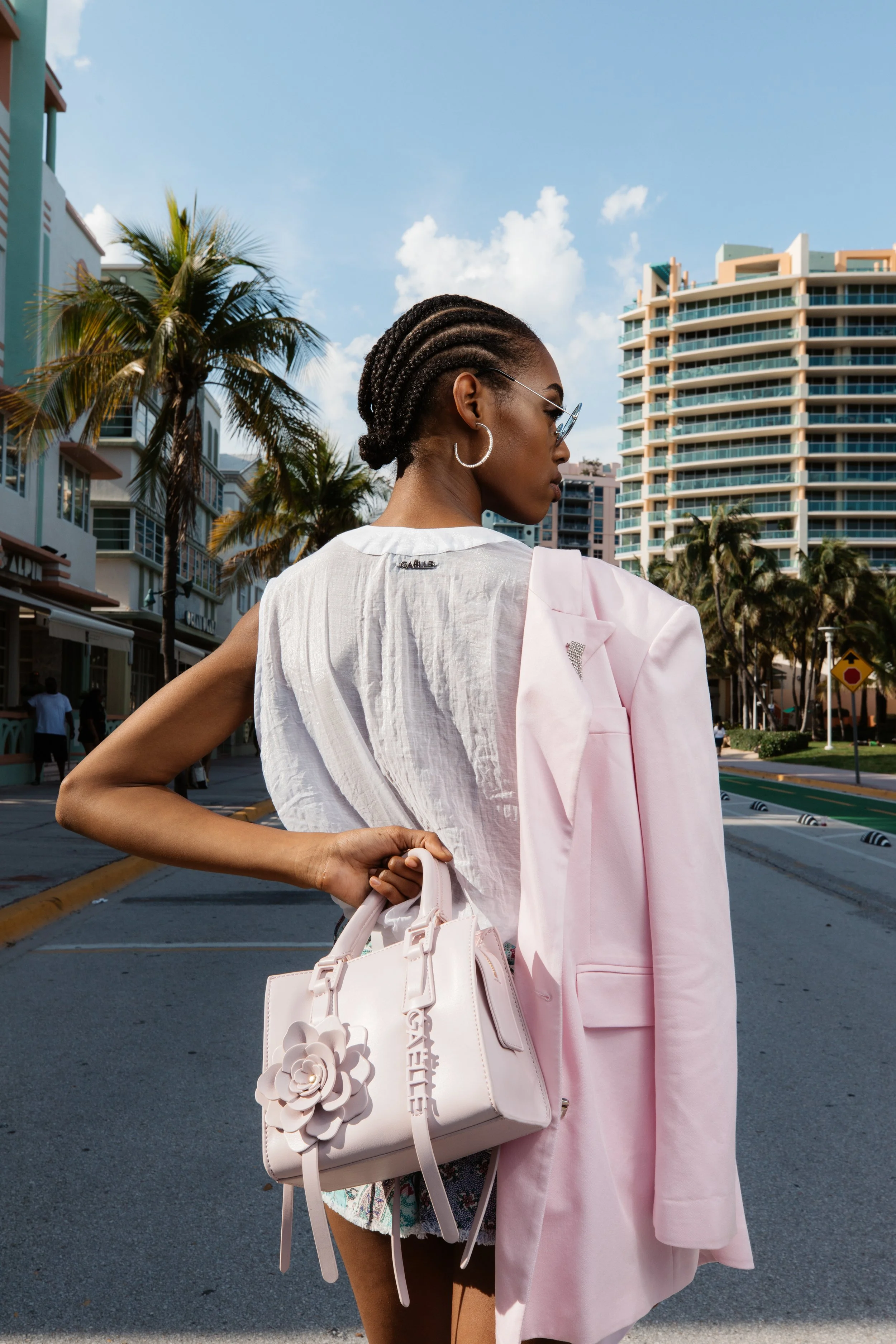 A woman with dark skin, wearing a pink blazer and white ruffled blouse, carries a light pink purse with a flower decoration on her shoulder. She is wearing sunglasses and standing on a sunny street with pastel-colored buildings and palm trees in the