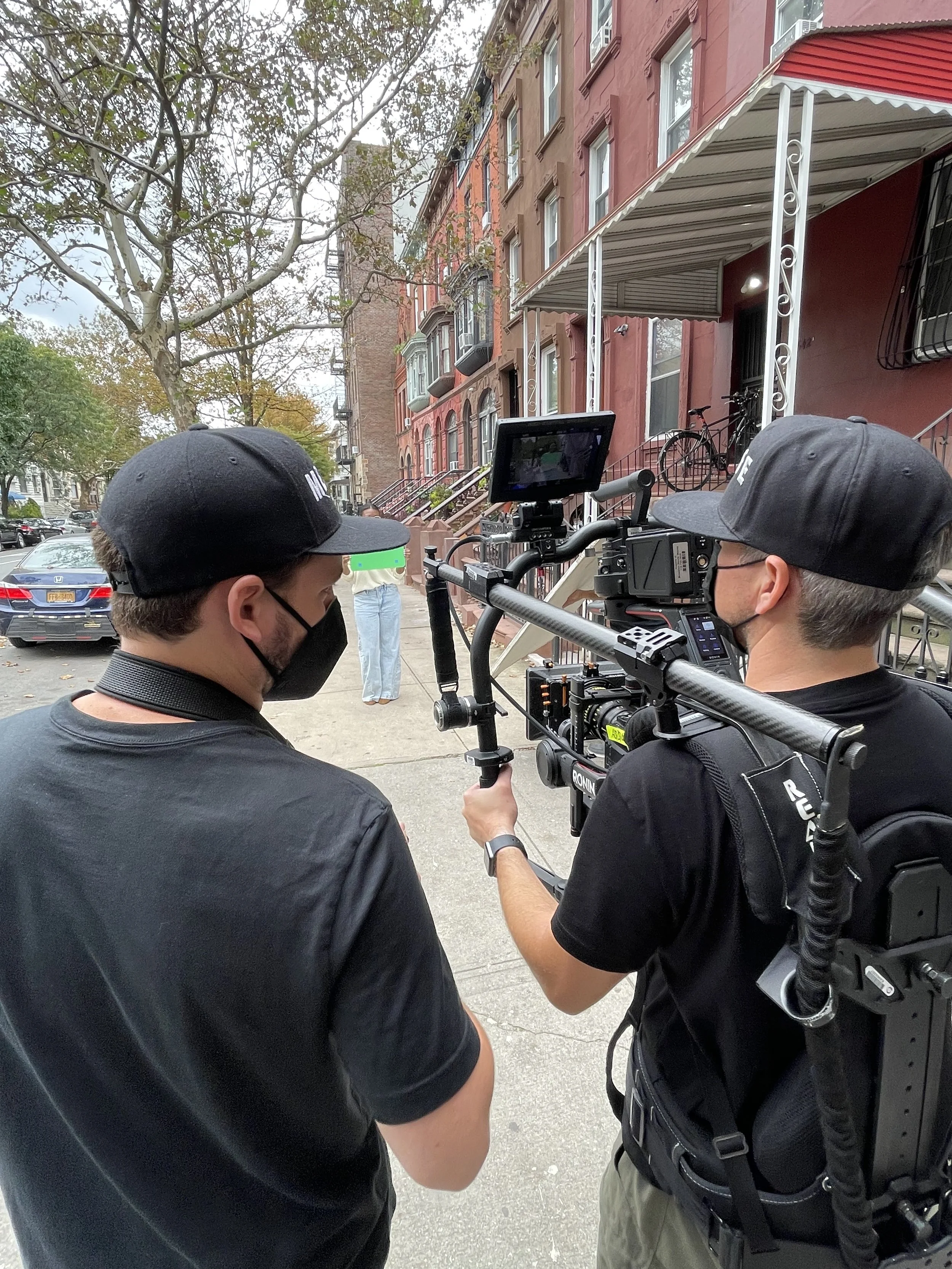 Filmmakers and crew members on set near camera equipment, with a large blue stage backdrop and lighting structures in the background.