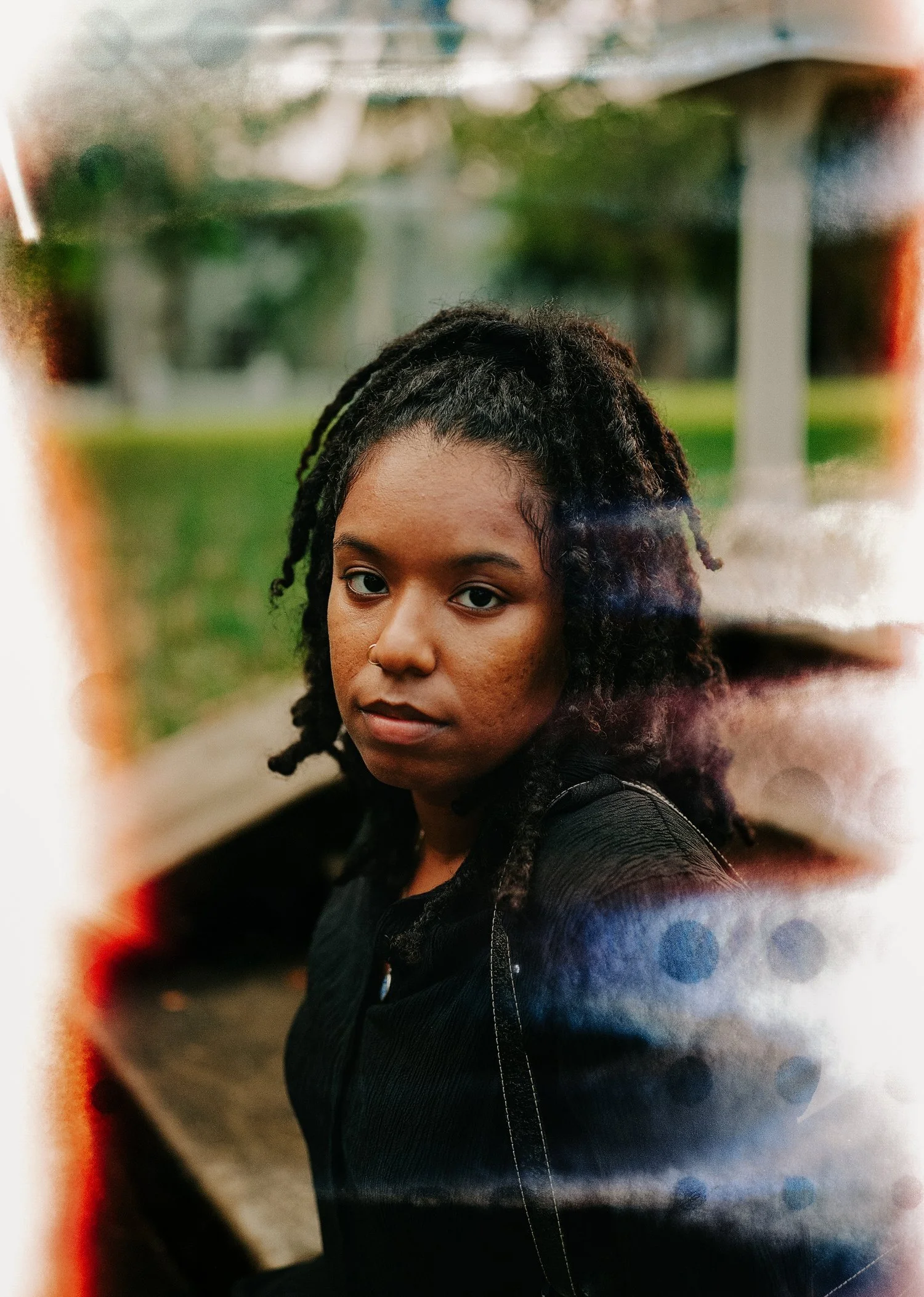 A young woman with dreadlocks and a nose ring looking at the camera in an outdoor park setting.