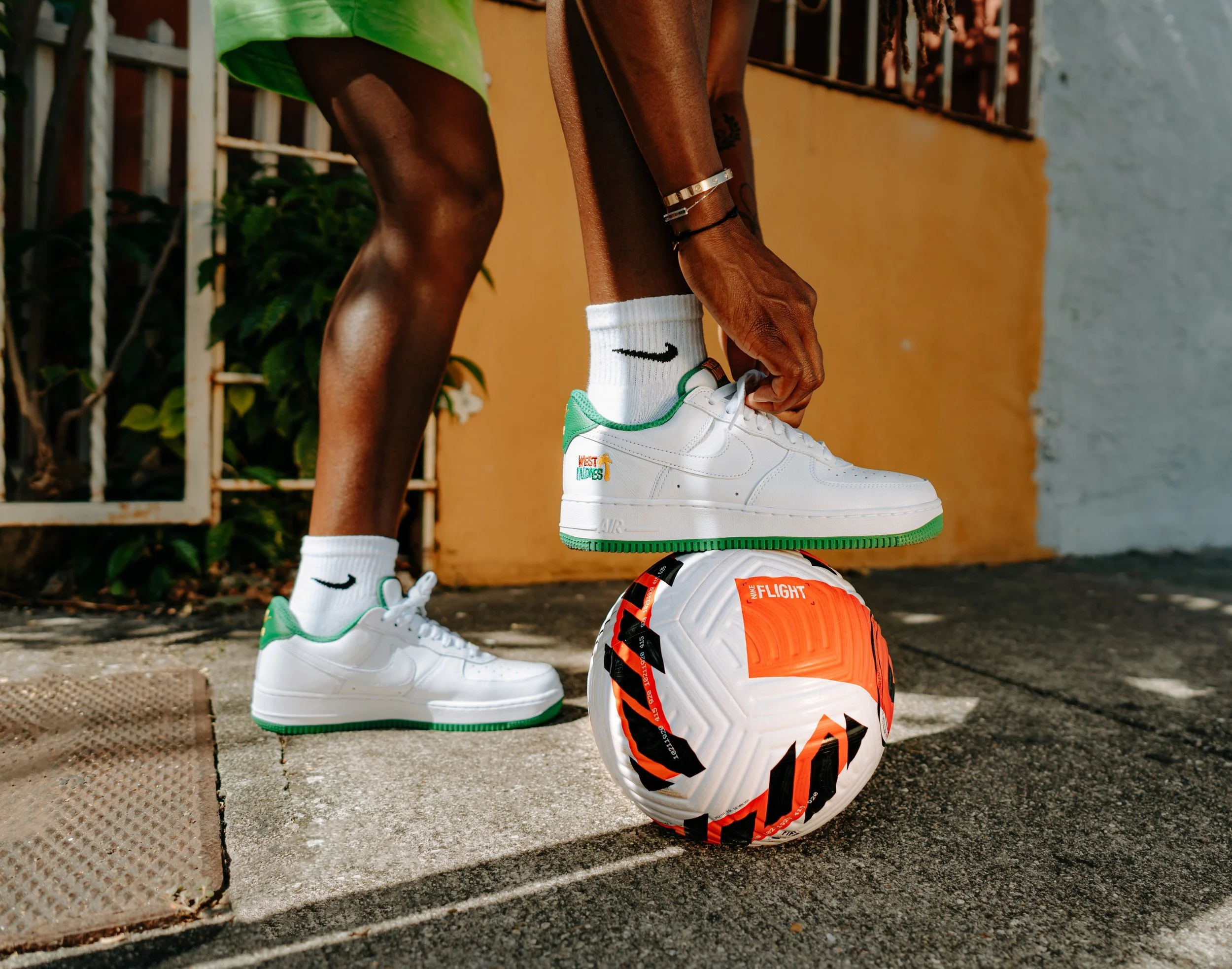 Person tying their white Nike Air Force sneakers with green accents on a sidewalk with a soccer ball nearby.