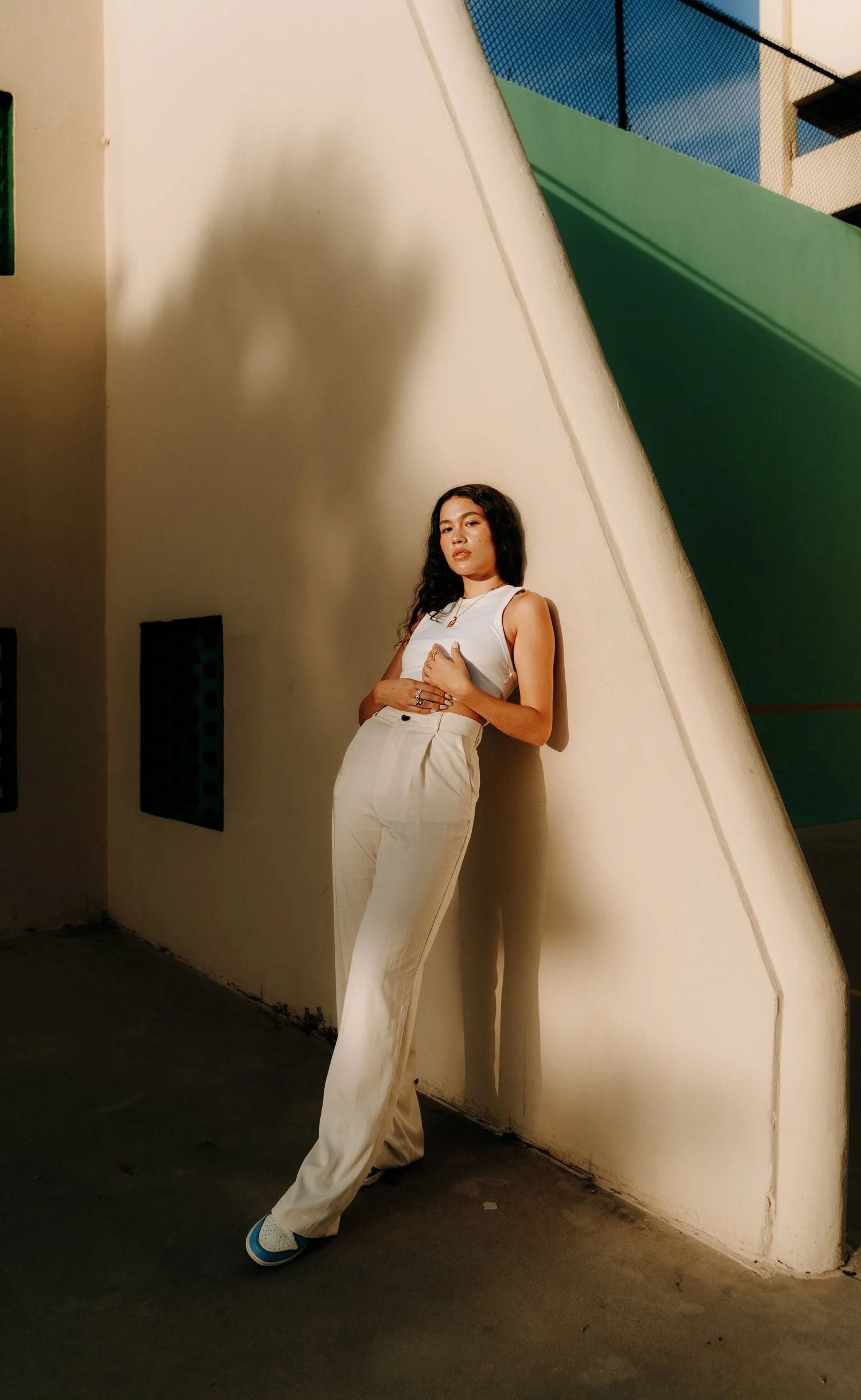 A young woman with dark curly hair, wearing a white sleeveless top and cream wide-leg pants, leaning against a cream-colored wall with geometric shadows, outdoors during late afternoon or early evening.