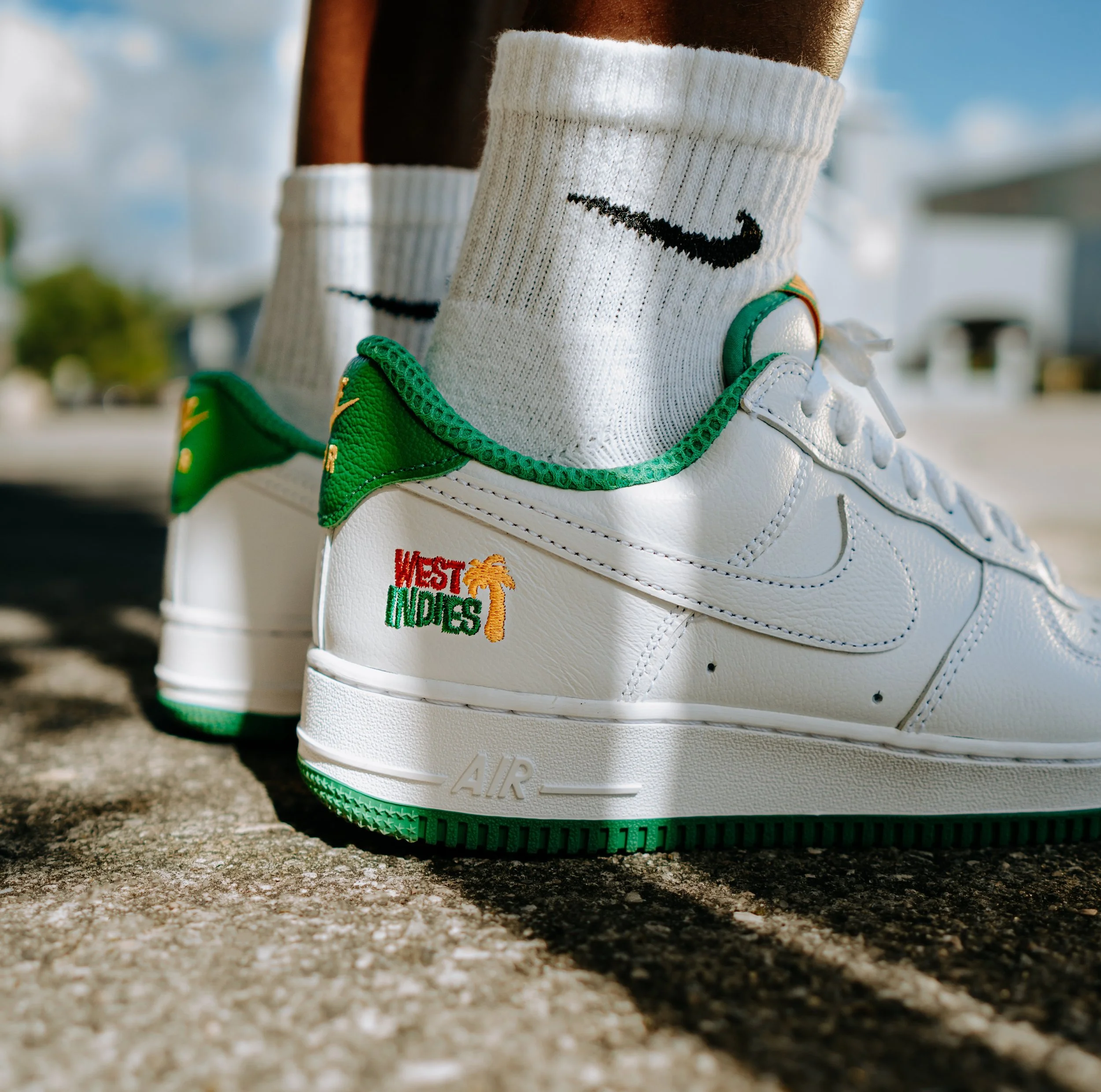 Close-up of a person wearing white Nike sneakers with green accents, and white Nike socks with black swoosh logo, on a concrete surface outdoors.