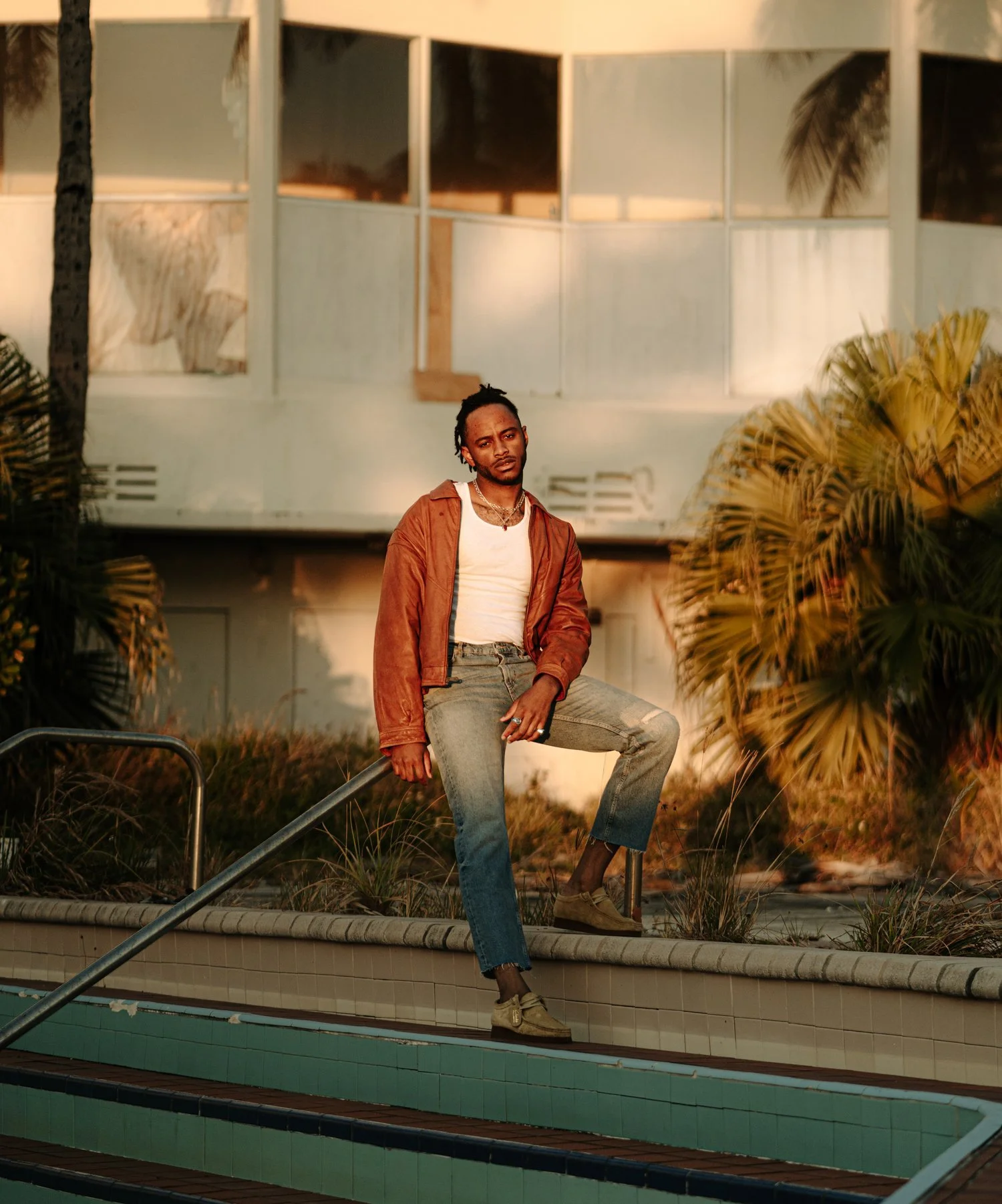 A young man with dreadlocks and a beard, wearing a brown jacket, white t-shirt, ripped jeans, and beige shoes, posing on the edge of a swimming pool at sunset with palm trees and a modern building in the background.