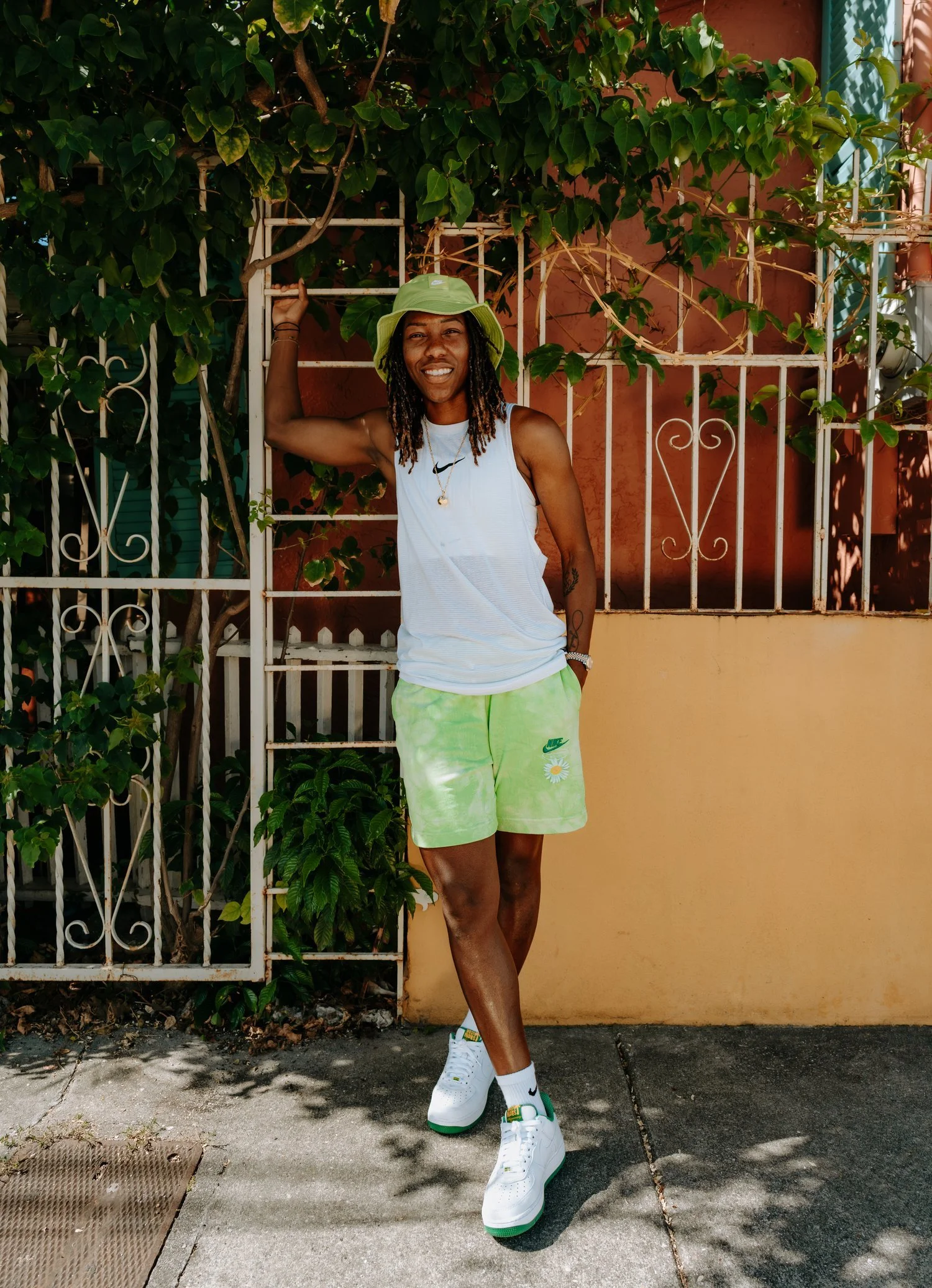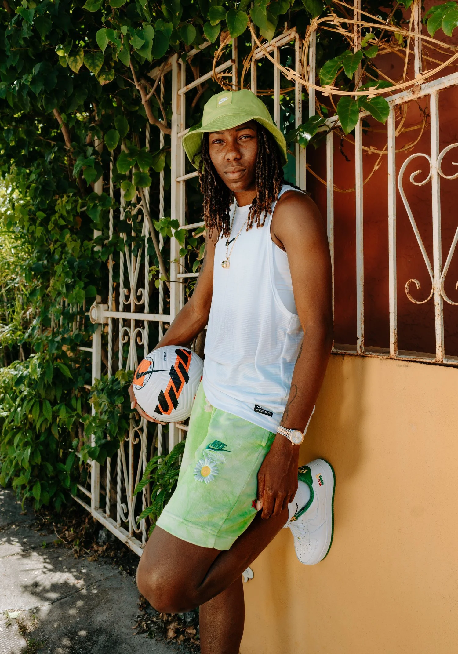 A person with long dreadlocks wearing a wide-brimmed green hat, white sleeveless shirt, tie-dye green shorts, and white sneakers, holding a soccer ball, leaning against a yellow wall with a metal gate and greenery in the background.