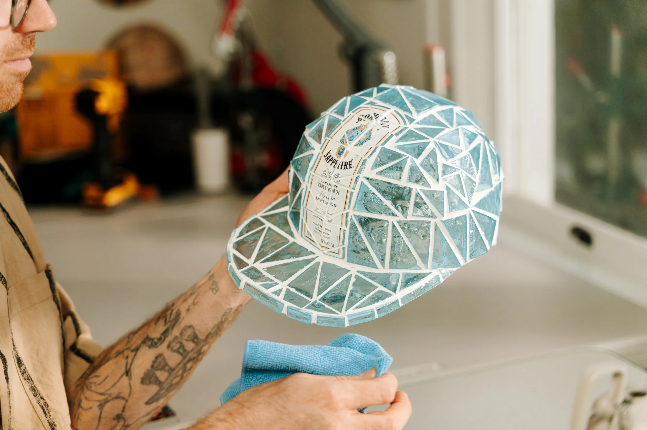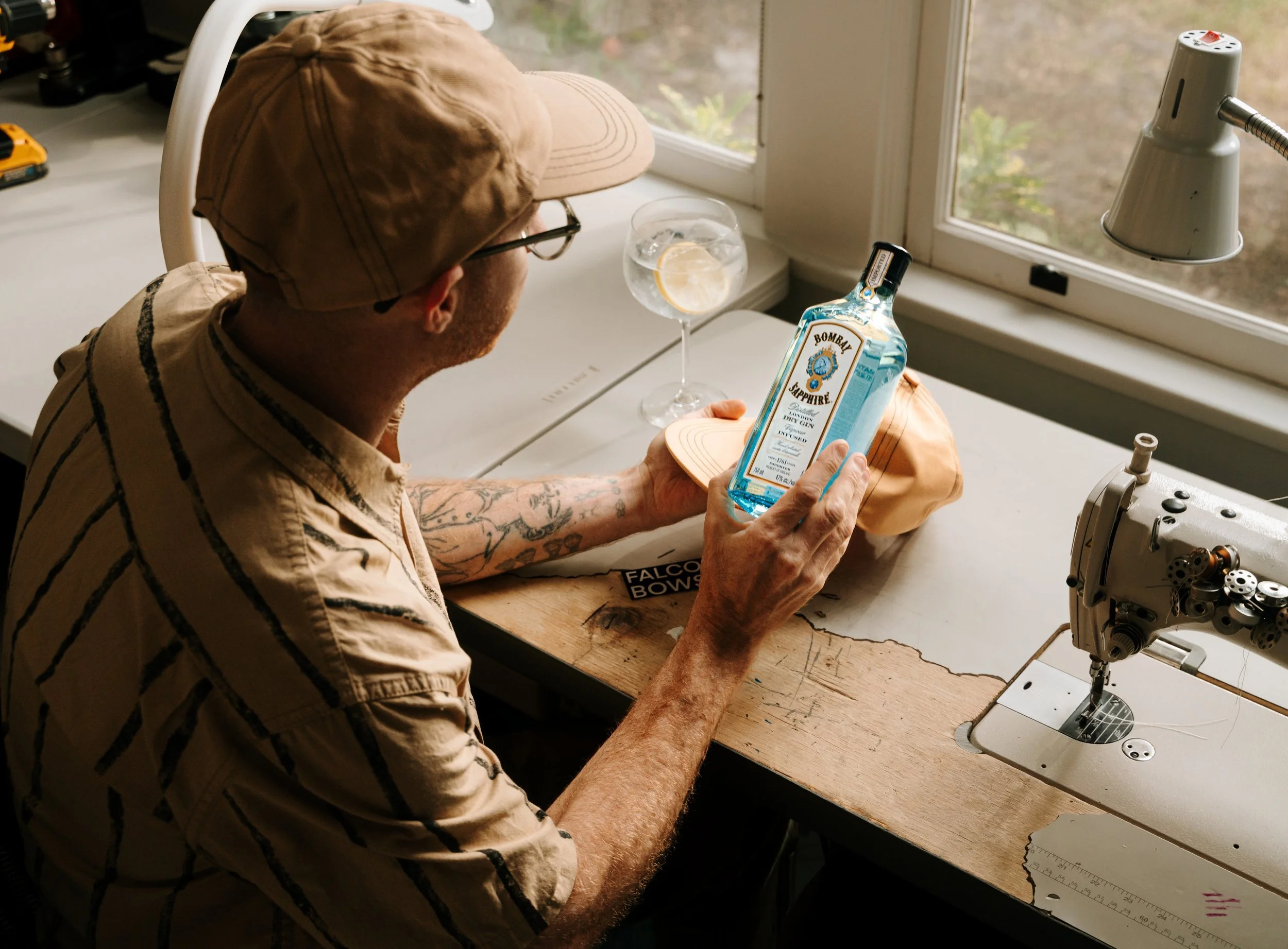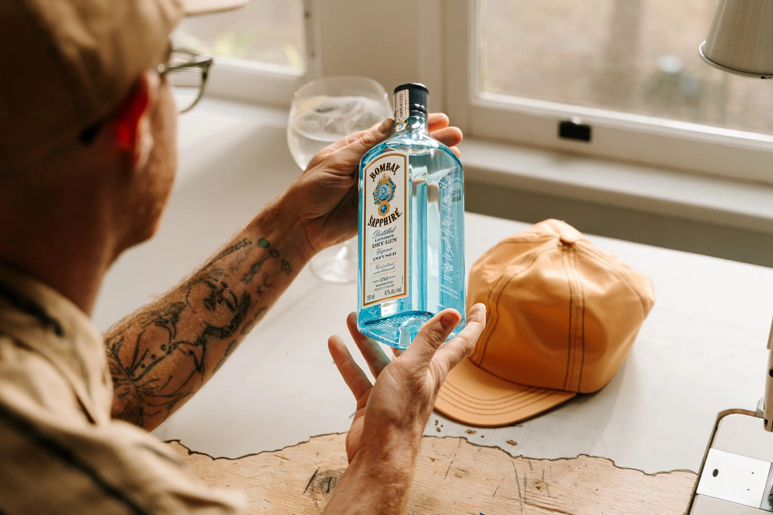 A person with tattoos on their arm holding a bottle of Bombay Sapphire gin near a window, with an orange cap on the table.