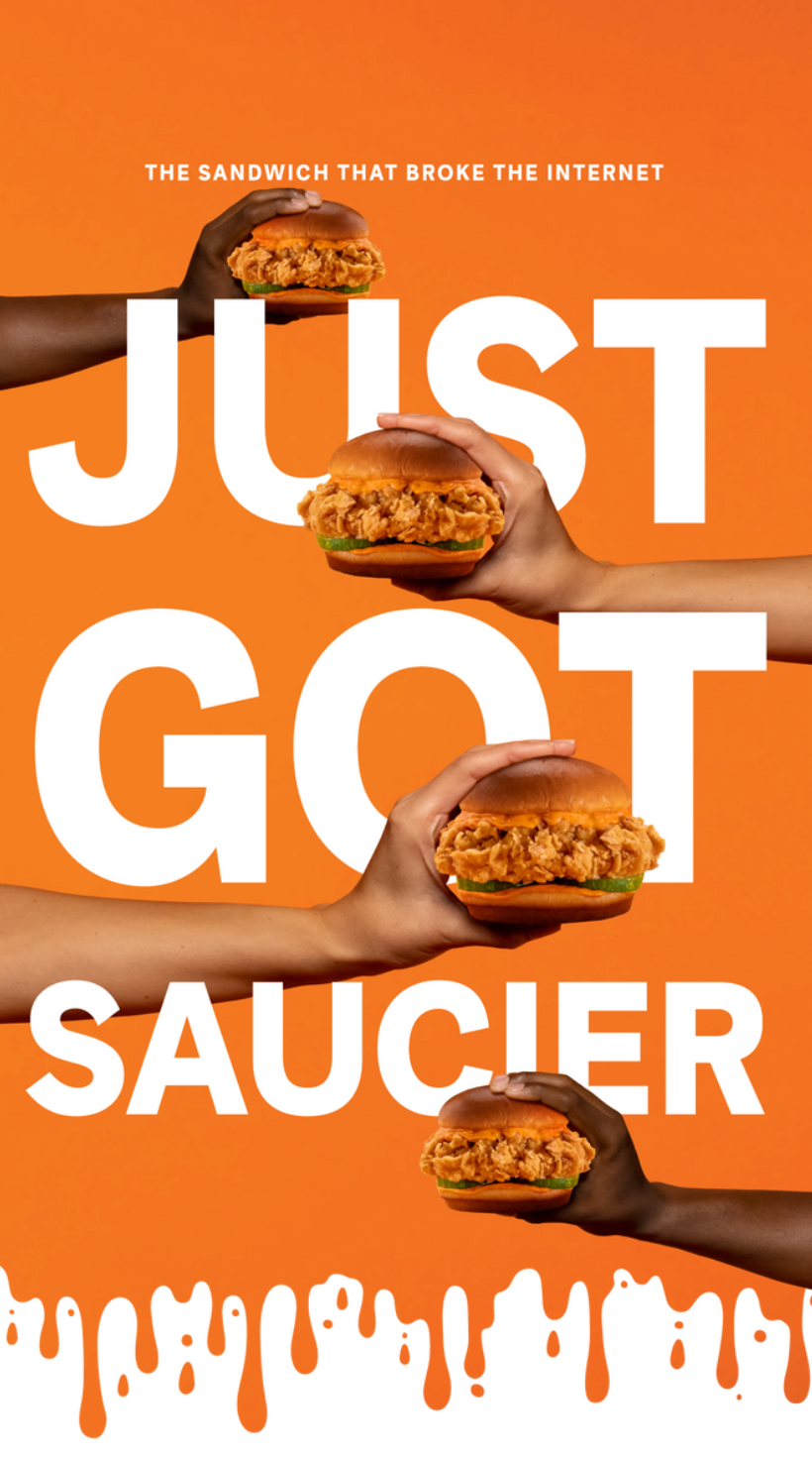Four hands holding fried chicken sandwiches against an orange background with large white text reading "JUST GOT SAUCER" and a subheading "The sandwich that broke the internet." The sandwiches have fried chicken, pickles, and buns.