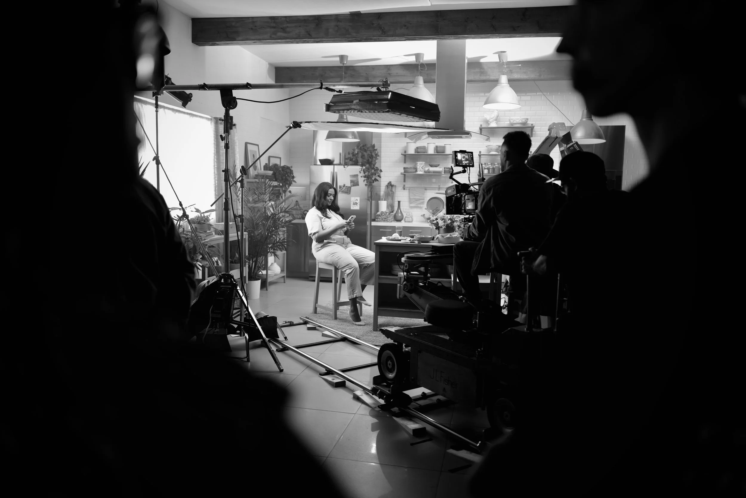 Black and white photo of a woman sitting on a stool in a kitchen filming a video, with a camera crew and equipment around her, inside a well-lit kitchen setting.