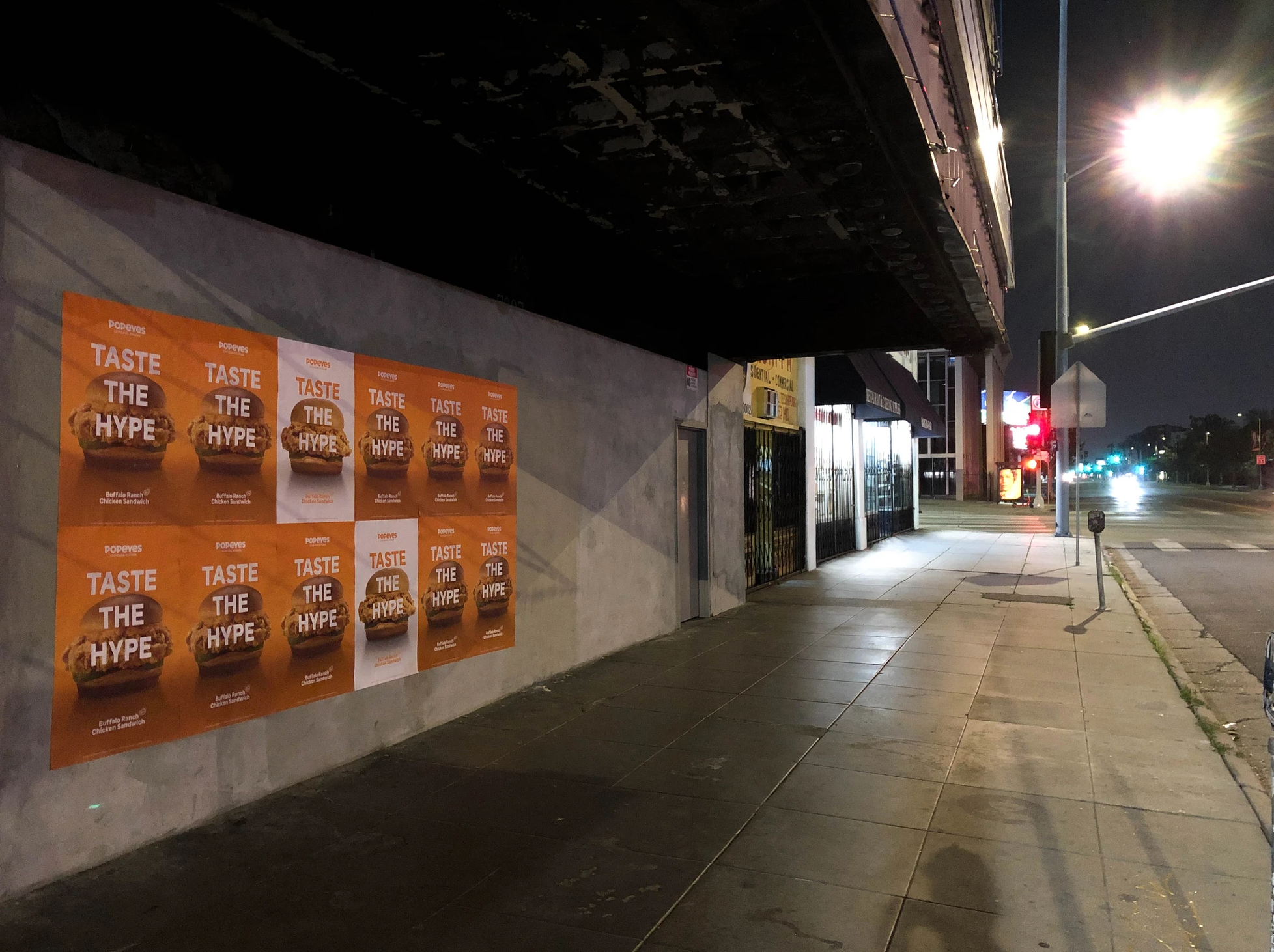 Nighttime urban street with a sidewalk, streetlights, and a wall displaying multiple posters for Popeyes featuring a chicken sandwich with the text "Taste the Hype."