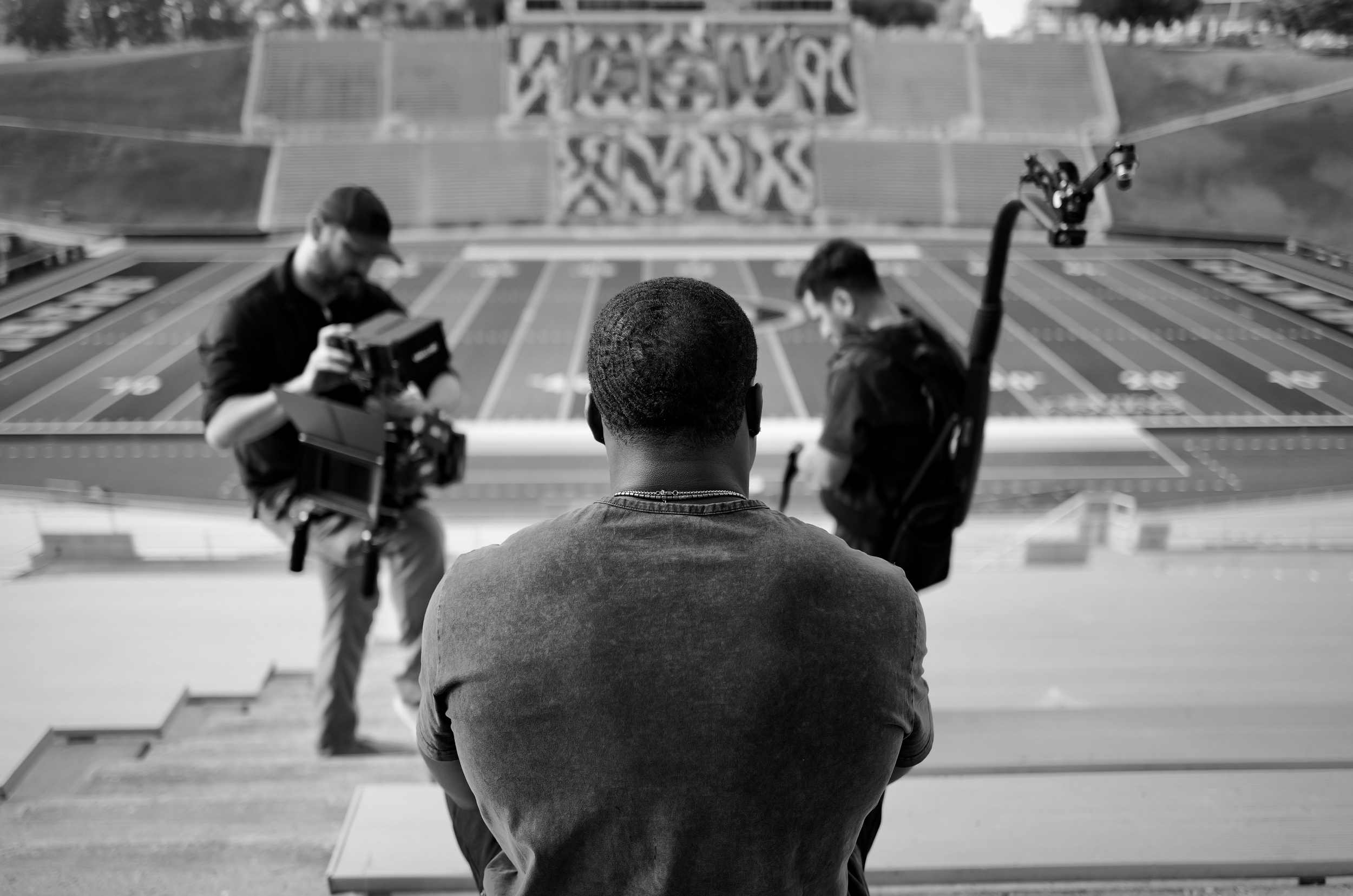 Three people on a stadium bleacher with a football field in the background. One person is sitting with back to camera, and two others are adjusting camera equipment. Black and white photo.