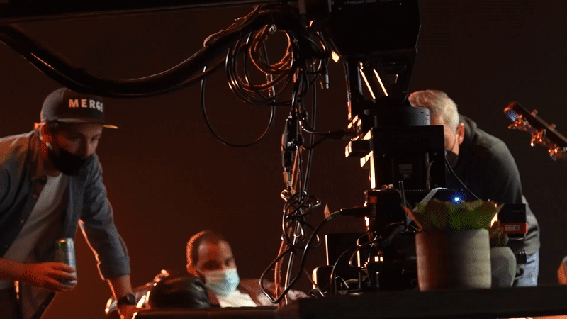 Filmmaking crew working on a set with camera equipment, crew members wearing masks, and ambient lighting