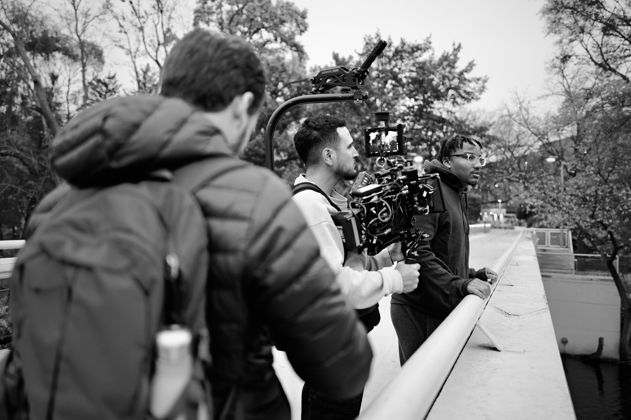 Behind-the-scenes of a film or photo shoot with three crew members on a bridge outdoors, one person operating a large camera rig, two others observing.