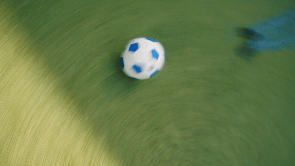 Blurred soccer ball with a blue and white pattern rolling on a green grassy field.