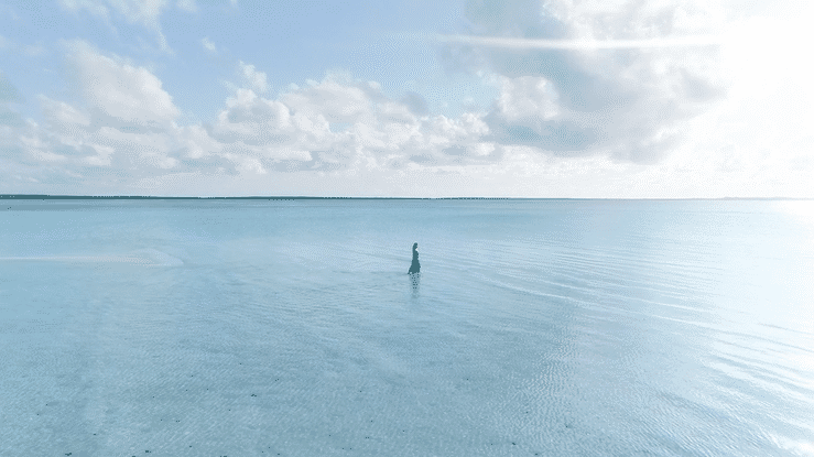 Person alone on a vast, shallow body of water under a partly cloudy sky.