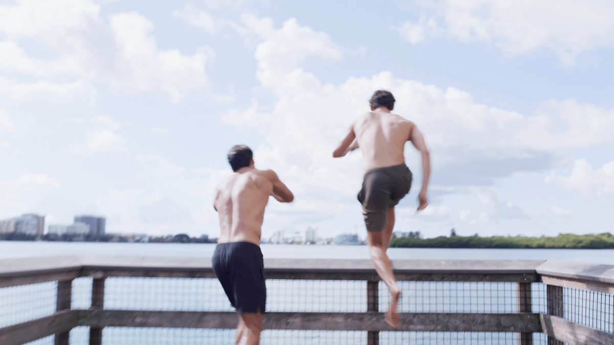 Two shirtless men in shorts jumping into a body of water from a wooden dock under a partly cloudy sky.