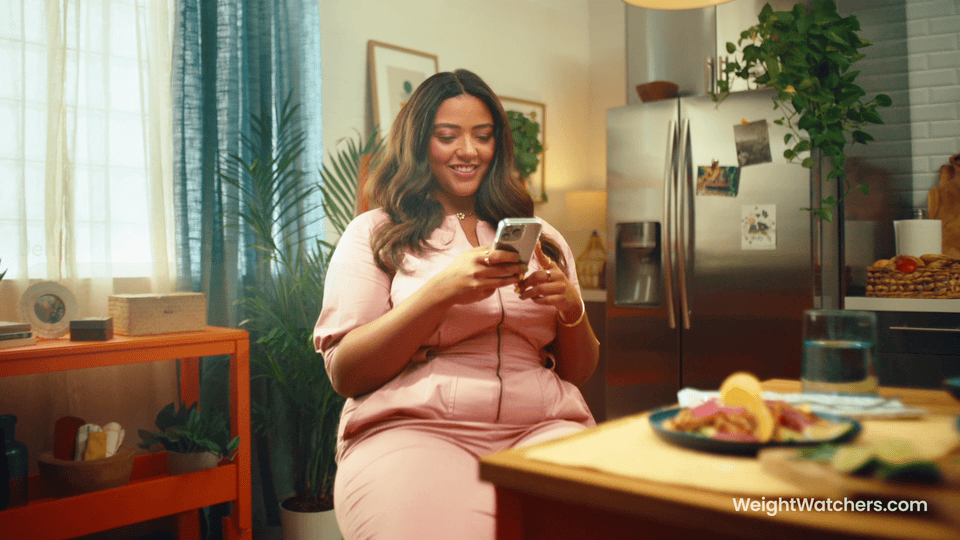 A woman in pink scrubs sitting in a kitchen, looking at her phone and smiling. There are plants, pictures, a fridge, and food on the table.