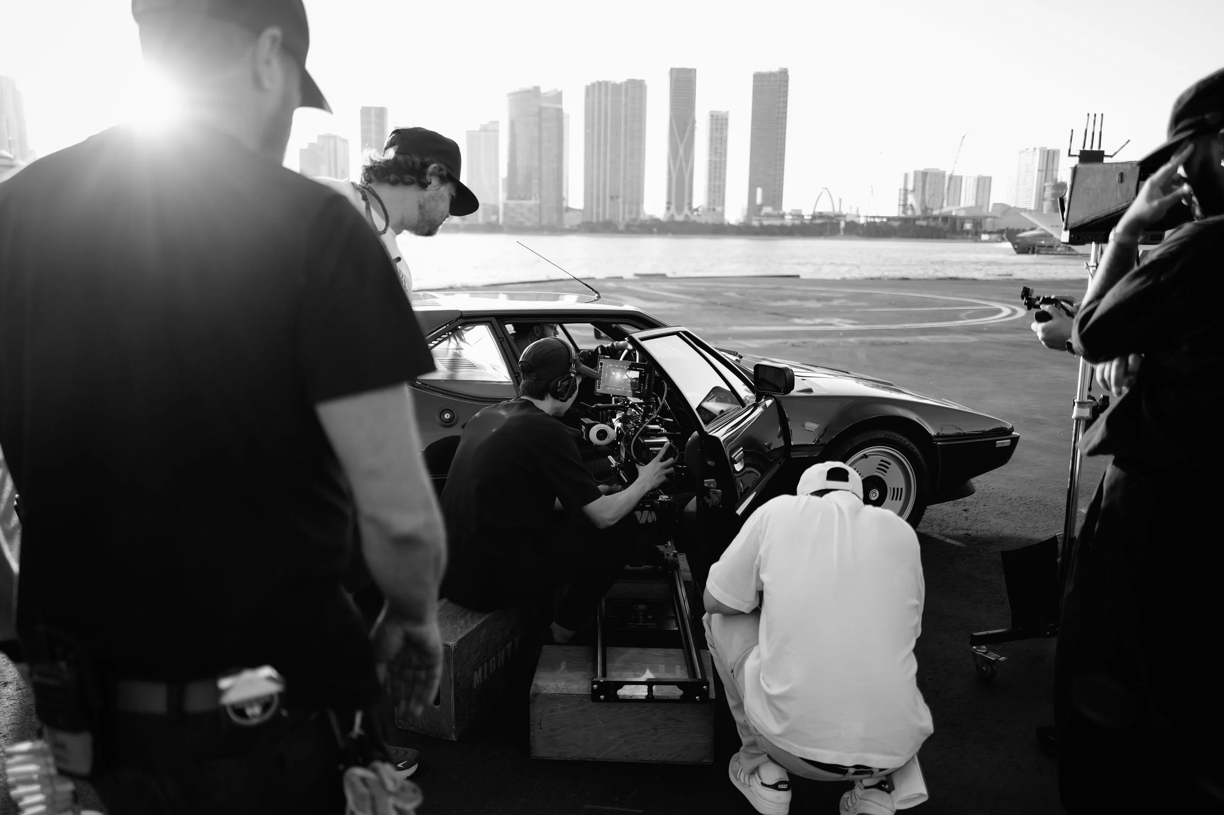 Filming crew assembled around a sleek, low-profile sports car near a waterfront with a city skyline in the background, capturing footage during sunset.